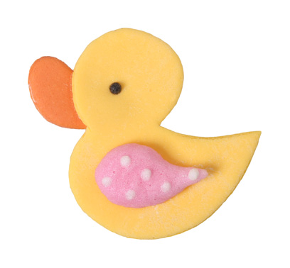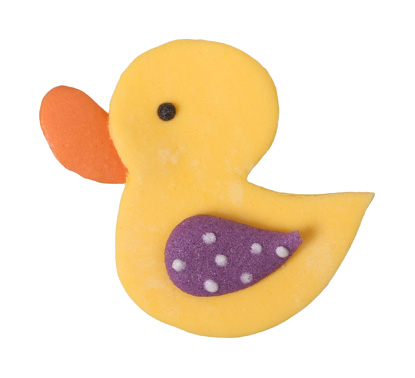 Handgefertigte gelbe Entchen aus Fondant mit bunten Flügeln