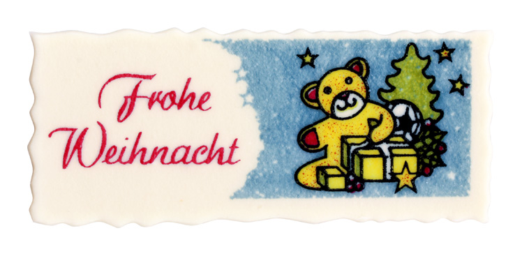 Handgefertigte, rechteckige Dekoraufleger Schriftstreifen. Bedruckt mit dem Schriftzug "Frohe Weihnachten" und Weihnachtlichen Motiven.