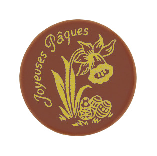 dem Schriftzug "Joyeuses Pâques" aus heller Kuvertüre