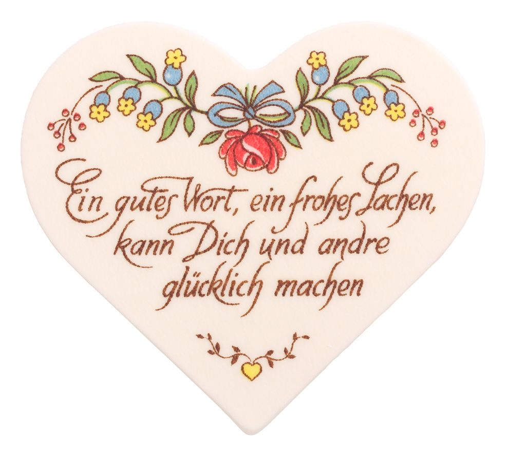 Handgefertigte Aufleger aus Dekormasse. Herzen bedruckt mit bunten Bauernmalereien und verschiedenen lustigen Sprüchen.