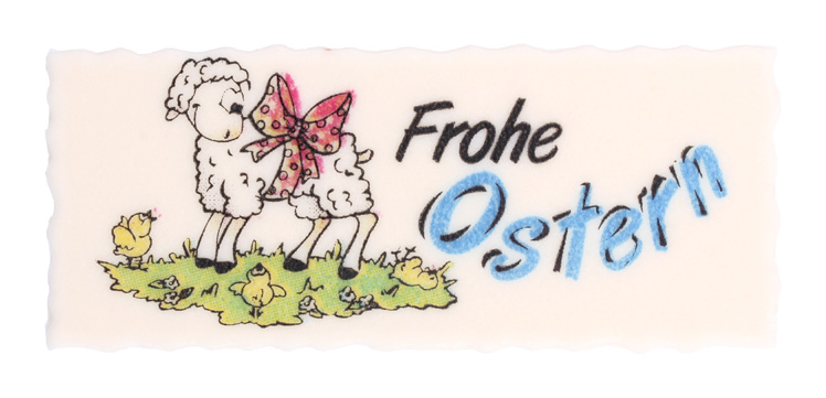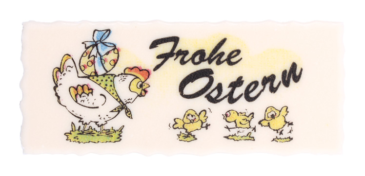 Handgefertigte Aufleger aus Dekormasse mit bunten Osterbildern und dem Schriftzug "Frohe Ostern"